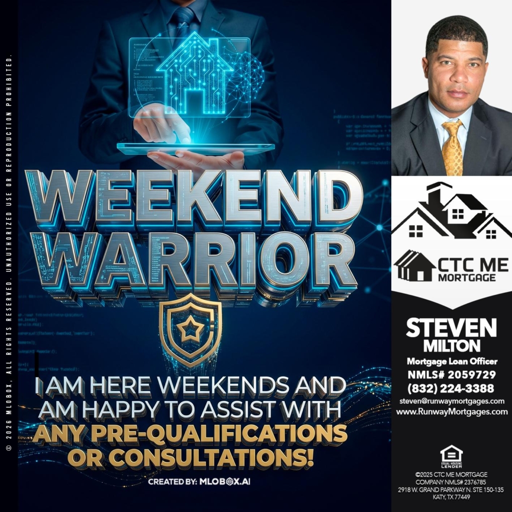 WEEKEND WARRIORS - Steven Milton -Mortgage Loan OfficerHi, my name is Steven Milton. I’m a Loan Officer with CTC Me Mortgage, offering personalized mortgage solutions, fast customized quotes, great rates and service with integrity.
